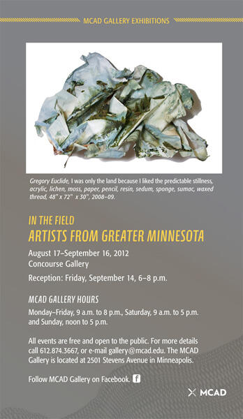 Fri, Aug 17, 2012, 12:00 p.m. —Sun, Sep 16, 2012, 12:00 p.m. Concourse Gallery Gallery Exhibition Image In the Field features fifteen artists who live in rural areas of the state and showcases the variety and depth of work being created by Minnesota artists outside of the Twin Cities metropolitan area. The show serves as a capstone to the college’s Greater Minnesota Arts Initiative. Over the past year, and with support from the Bush Foundation, MCAD instructors taught two Design in the Community classes focused on the Upper Minnesota River Valley and the greater Grand Rapids areas. The MCAD students who participated met with local residents and discussed creative ways to use skills learned at MCAD to help address challenges faced by rural communities. Based on the community discussions occurring in these classes, MCAD developed a summer fellowship program where students lived in the Montevideo and Grand Rapids areas for two weeks. While living in the communities, student fellows worked on community service projects that capitalized on their art and design talents. Throughout this process, the college came into contact with many rural artists dedicated to practicing their art while also working to ensure that greater Minnesota’s vibrant and eclectic arts scene continues to flourish. In the Field is a sampling of the work of these talented and dedicated individuals. Participating artists include: Audrey Arner, Jon Billing, Gregory Euclide ’08 MFA, Kristi Link Fernholz, Malena Handeen, Richard Handeen, Laurie Jacobi, Karen Jensen, Glenna Olson, Deborah Page ’74, Tom Page ’71, Dale Pederson, Franz Allbert Richter, Gene Tokheim, and Lucy Tokheim.